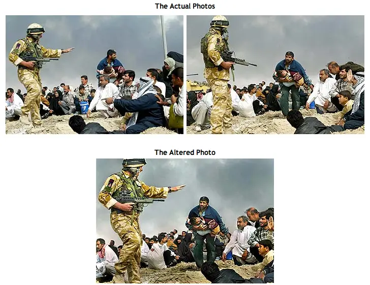 The published photo is a composite of two images taken seconds apart. After the Hartford Courant published the image, a Courant employee noticed a duplication of civilians in the background. The Los Angeles Times confronted Walski, who confessed to having digitally merged the two photographs to improve the composition.