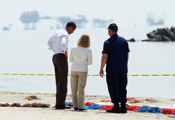 In the original photo, President Obama is standing next to Admiral Thad W. Allen of the Coast Guard and local parish president Charlotte Randolph. In July 2010, The New York Times Media Decoder blog revealed that Ms. Randolph was digitally removed and Admiral Allen was cropped from of the cover.