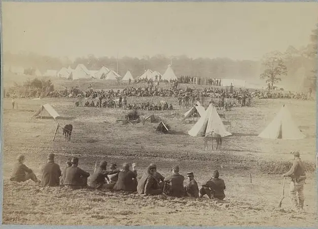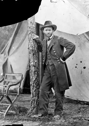 General Ulysses S. Grant sits atop his horse before his troops in City Point, Virginia, during the American Civil War.