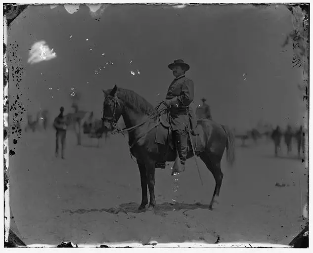 The body and horse in this image were taken from a portrait of Major General Alexander McDowell McCook in Washington D.C. The background, supposedly featuring Grant’s troops, was taken from a photo of Confederate prisoners captured during the battle of Fisher’s Hill in Virginia.