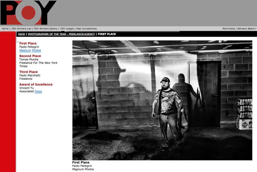 The photo was also staged, a fact not divulged in the caption. Keller questioned Paolo Pellegrin’s ethics by requesting to visit a shooting range. He also found it strange that Pellegrin refused additional information about Keller – like his name.