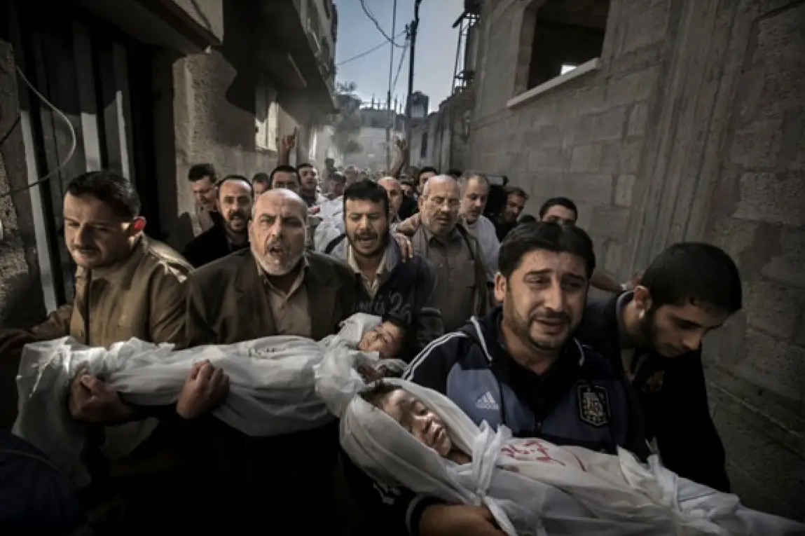 Swedish photographer Paul Hansen won the 2013 World Press Photo of the Year award for this image. The photo is published on the World Press Photo (WPP) site with the following caption: “The bodies of two-year-old Suhaib Hijazi and his elder brother Muhammad, almost four, are carried by their uncles to a mosque for their funeral, in Gaza City. The children were killed when their house was destroyed by an Israeli airstrike on 19 November. The strike also killed their father, Fouad, and severely injured their mother and four other siblings.”