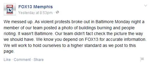FOX13 issued a public apology: “We messed up. As violent protests broke out in Baltimore Monday night, a member of our team posted a photo of buildings burning and people rioting. It wasn’t Baltimore. Our team didn’t fact check the picture the way we should have. We know you depend on FOX13 for accurate information. We will work to hold ourselves to a higher standard as we post to this page.”