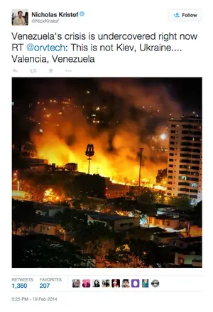 The photo was taken in Valencia, Venezuela during a period of unrest in February of 2014. The photo was shared by several Twitter users, including New York Times journalist Nicholas Kristof, to show what was happening in Venezuela. The photographer remains unknown.