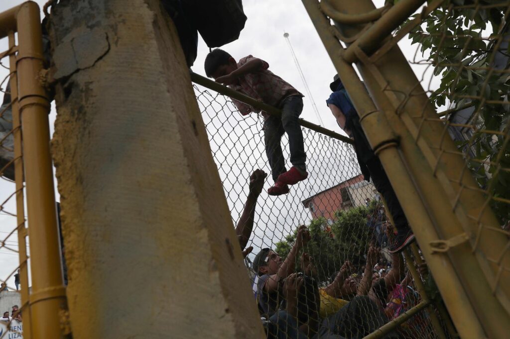 CIUDAD TECUN UMAN, GUATEMALA – OCTOBER 19, 2018: A boy in the migrant caravan climbs over a fence on the Guatemalan side of a bridge to Mexico. The caravan of thousands of immigrants, most from Honduras, crossed the bridge and pried open the gate into Mexico but were pushed back by Mexican riot police.