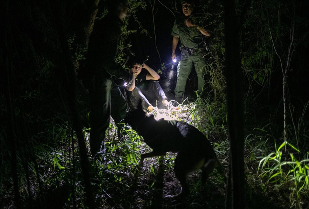 MISSION, TX – SEPTEMBER 10, 2019: A U.S. Border Patrol K-9 unit detains an undocumented immigrant from China. He had crossed the Rio Grande into Texas with a group earlier in the day, according to border agents who tracked them.