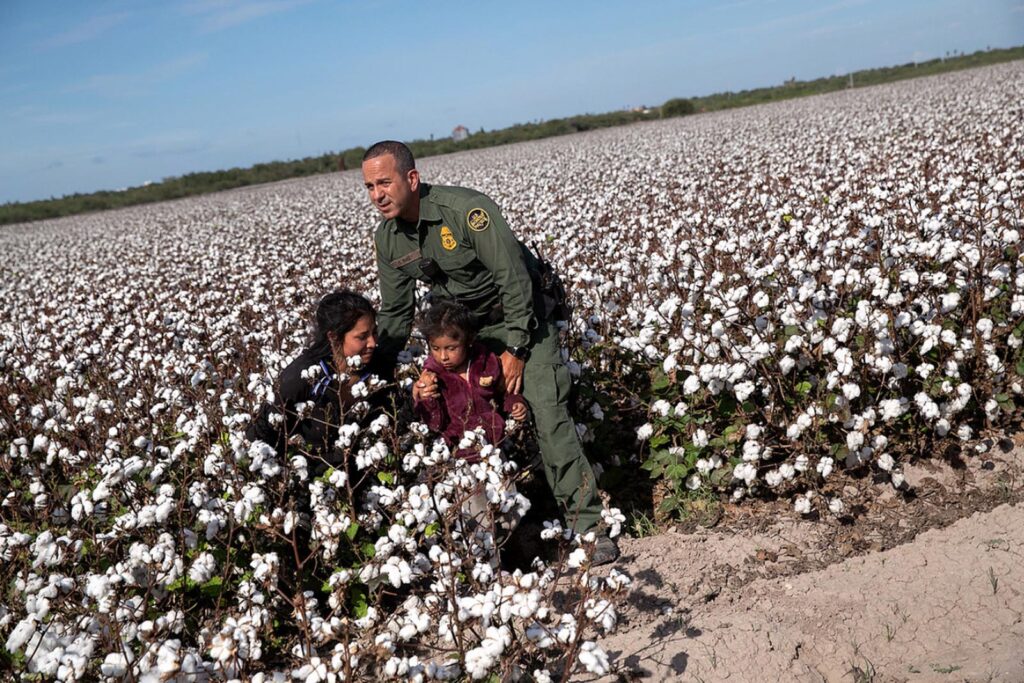 PENITAS, TX – SEPTEMBER 10, 2019: U.S. Border Patrol agent Carlos Ruiz apprehends a mother and daughter from Ecuador. The undocumented immigrants had been hiding for hours in a cotton field after border agents detected and chased their group earlier in the day.